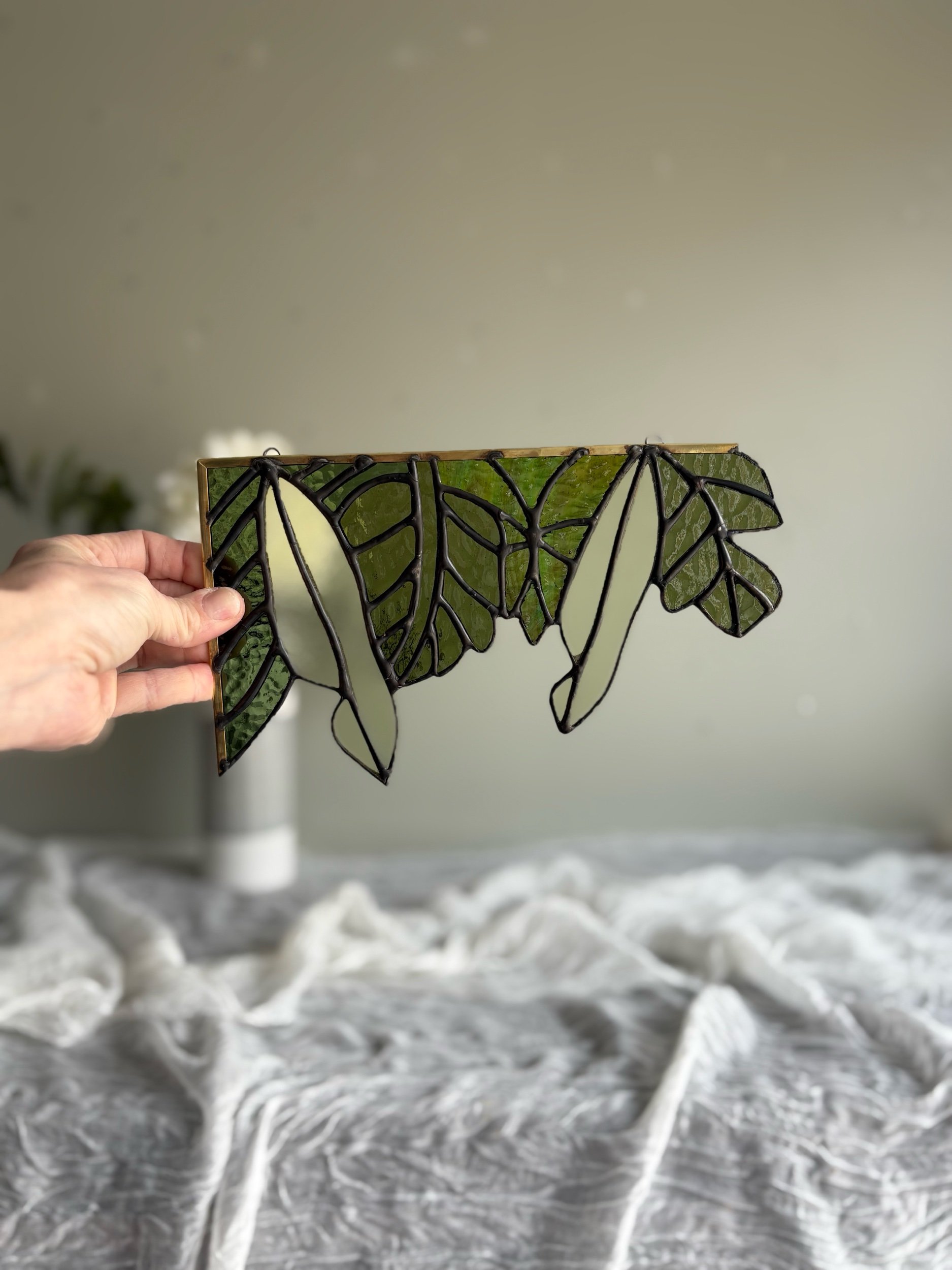 Image 1 of 2 Image 2 of 2 Transparent Tropical Leaf Suncatcher (Left Orientation) $230.00 Please note that this product contains leadSize: 9.5×5in Purchase Added! Please note that this product contains leadSize: 9.5×5in