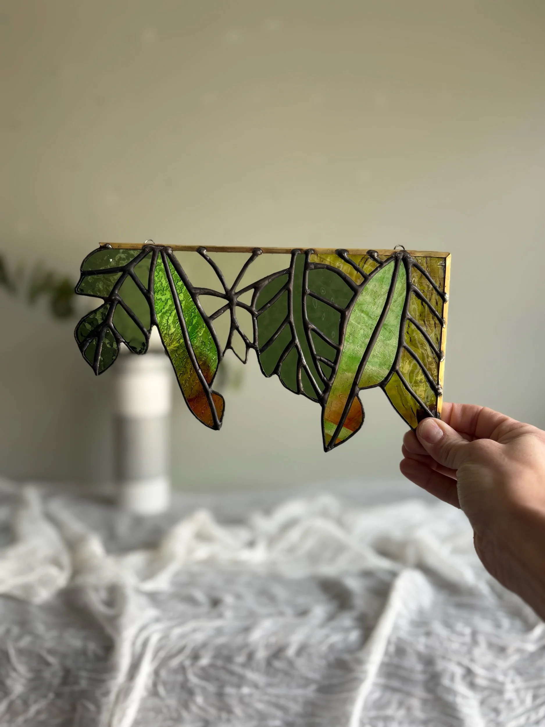 Image 1 of 2 Image 2 of 2 Transparent Tropical Leaf Suncatcher (Right Orientation) $230.00 Please note that this product contains leadSize: 9.5×5in Purchase Added! Please note that this product contains leadSize: 9.5×5in
